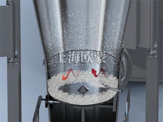 空氣經(jīng)加熱凈化后,由引風(fēng)機從下部導(dǎo)入,穿過料斗的孔網(wǎng)板。在工作室內(nèi),經(jīng)攪拌和負(fù)壓作用形成流態(tài)化,水份快速蒸發(fā)后隨著排氣帶走,物料快速干燥。